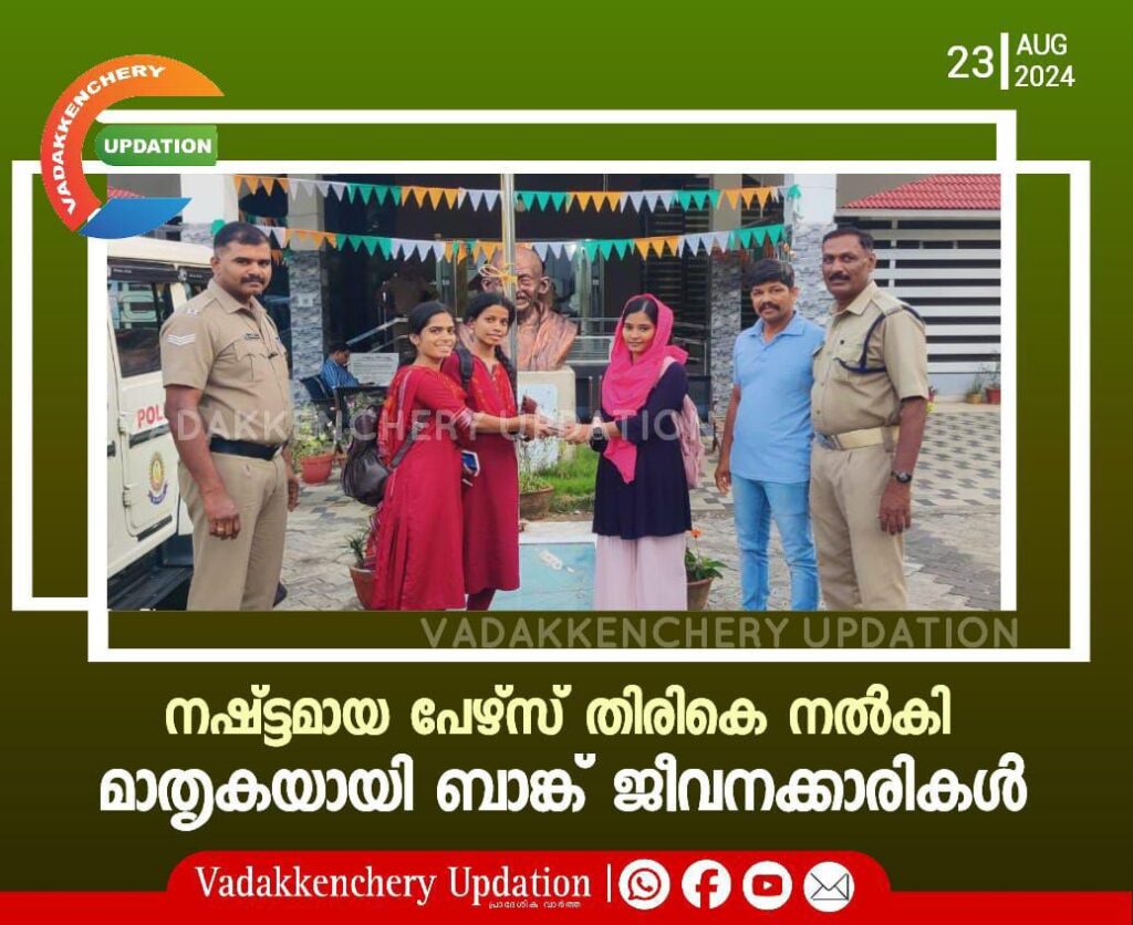 ആലത്തൂർ ബസ്സ് സ്റ്റാൻഡിൽ നിന്നും കളഞ്ഞു കിട്ടിയ പേഴ്സ് തിരികെ നൽകി മാതൃകയായി ഐ. സി.ഐ.സി.ഐ ബാങ്ക് ജീവനക്കാരികളായ കൃഷ്ണയും ശ്രുതിയും.വൈകുന്നേരം മാർക്കറ്റിങ്ങിന് ഇറങ്ങിയപ്പോളാണ് ഇരുവർക്ക് പേഴ്സ് കളഞ്ഞുകിട്ടിയത്.
