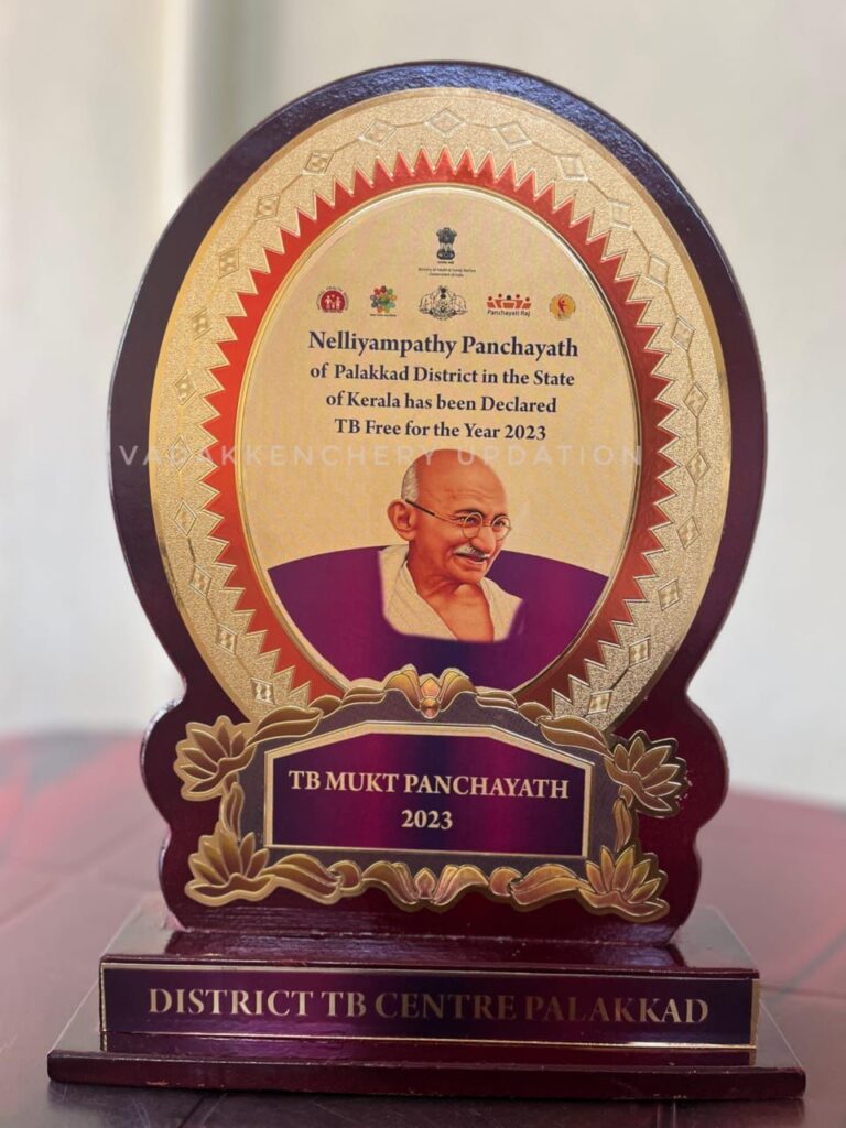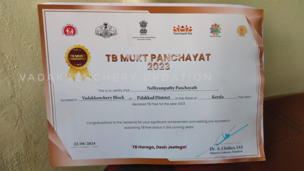 ജില്ലയിലെ ആദ്യത്തെ ടി ബി മുക്ത പഞ്ചായത്തായി നെല്ലിയാമ്പതി ഗ്രാമപഞ്ചായത്തിനെ തിരഞ്ഞെടുത്തു. ദേശീയ ക്ഷയ രോഗ നിർമാർജന പരിപാടിയുടെ ഭാഗമായി സംസ്ഥാന ആരോഗ്യ വകുപ്പിന്റെ നേതൃത്വത്തിൽ ജില്ലാ മെഡിക്കൽ ഓഫിസ് (ആരോഗ്യം ), ദേശീയ ആരോഗ്യ ധൗത്യവും, ജില്ലാ ടി ബി സെന്റർ പാലക്കാടും, സംയുക്തമായി പാലക്കാട് ജില്ലാശുപത്രിയിൽ ഇന്നലെ നടത്തിയ “അക്ഷയ ജ്യോതി 2.0” ജില്ലാതല ഉൽഘടനത്തിൽ ബഹു. സംസ്ഥാന വൈദ്യുതി വകുപ്പ് മന്ത്രി ശ്രീ കെ. കൃഷ്ണൻകുട്ടി അവർകളുടെ കയ്യിൽ നിന്നും നെല്ലിയാമ്പതി പഞ്ചായത്ത് പ്രസിഡന്റ് പ്രിൻസ് ജോസഫ് ,മെഡിക്കൽ ഓഫീസർ ഡോ പി. ലക്ഷ്മി, ഹെൽത്ത് ഇൻസ്പെക്ടർ ജെ. ആരോഗ്യം ജോയ്സൺ, ജൂനിയർ ഹെൽത്ത് ഇൻസ്പെക്ടർ മാരായ അഫ്സൽ ബി, സൈനു സണ്ണി എന്നിവർ പുരസ്കാരം സ്വീകരിച്ചു.