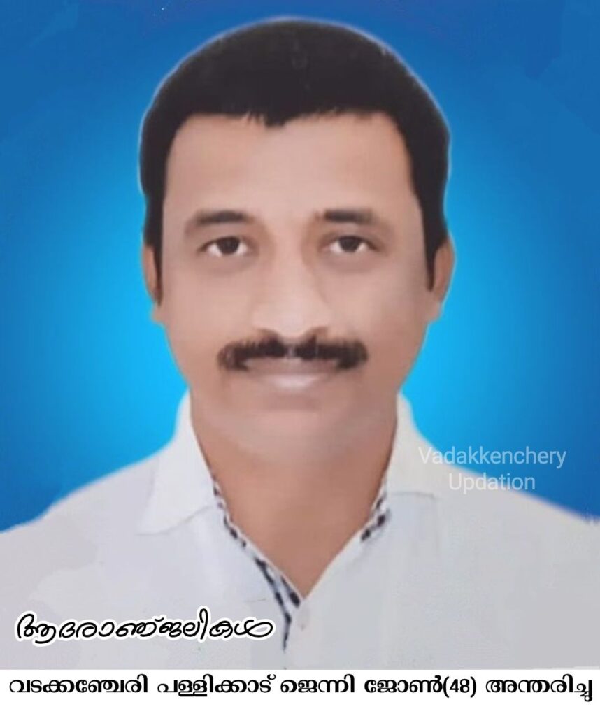 വടക്കഞ്ചേരി പള്ളിക്കാട് പരേതനായ ജോൺ മകൻ ജെന്നി ജോൺ (48) അന്തരിച്ചു . മാതാവ് : ലിസ ജോൺ , ഭാര്യ : ജിജി ,മക്കൾ : ജെയ്സ്, ജിൻസ് , സഹോദരൻ : ടിജോ ജോൺ. സംസ്കാരം നാളെ (29.08.2024) കാലത്ത് 10 മണിക്ക് വടക്കഞ്ചേരി ലൂർദ്ദ് മാതാ ഫൊറോന പള്ളിയിൽ നടക്കും.