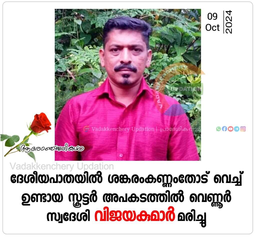 ദേശീയപാത വടക്കഞ്ചേരി പന്നിയങ്കര ശങ്കരംകണ്ണംതോടിന് ഉള്ള കുഴിയിൽ വീണ് തെറിച്ച് വീണ സ്കൂട്ടർ യാത്രക്കാരൻ മരിച്ചു.ഒരാൾക്ക് പരിക്ക്. തൃശൂർ വെണ്ണൂർ മാഞ്ചാടി മങ്കരവീട്ടിൽ വിജയകുമാർ (48) ആണ് മരിച്ചത്.കൂടെ സഞ്ചരിച്ച ബന്ധു മാഞ്ചാടി മങ്കര വീട്ടിൽ സാനിഷ് (30 ) ന് പരിക്കേറ്റു. ചൊവ്വാഴ്ച വൈകുന്നേരം അഞ്ചരയോടുകൂടി ചെമ്മണാംകുന്ന് ക്ഷീരസംഘത്തിന് മുൻവശത്താണ് അപകടം സംഭവിച്ചത്.വടക്കഞ്ചേരി ഭാഗത്തേക്ക് വരുകയായിരുന്ന സ്കൂട്ടർ നിയന്ത്രണം തെറ്റി മറിയുകയായിരുന്നു.ദേശീയപാത നിർമ്മാണത്തിലെ അപാകതയാണ് അപകടകാരണമെന്ന് പറയുന്നു. ഈ ഭാഗത്ത് കുഴി രൂപപെട്ടിട്ട് മാസങ്ങളായിട്ടും ശാസ്ത്രീയമായ രീതിയിൽ ടാറിംഗ് ചെയ്യാൻ ഇതുവരെ നടപടി സ്വീകരിച്ചിട്ടില്ല അപകടത്തിൽ പെട്ടവരെ ഉടൻ തന്നെ തൃശൂരിലെ സ്വകാര്യ ആശുപത്രിയിൽ എത്തിച്ചെങ്കിലും മരിച്ചു.വിജയകുമാറിൻ്റെ മൃതദേഹം സ്വകാര്യ ആശുപത്രി മോർച്ചറിയിൽ.