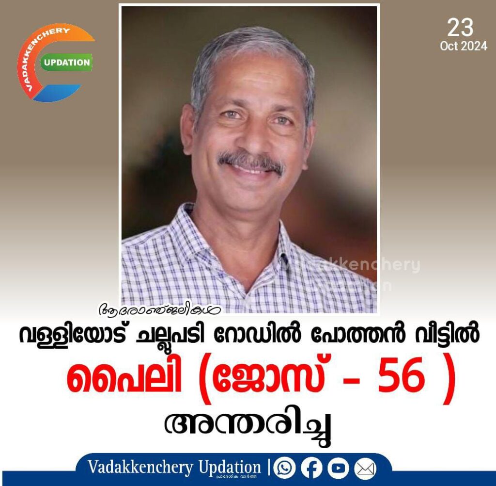 വടക്കഞ്ചേരി വള്ളിയോട് ചല്ലുപടി റോഡിൽ പോത്തൻ വീട്ടിൽ പൈലി (ജോസ് – 56 ) അന്തരിച്ചു. സംസ്കാരം പിന്നീട്.