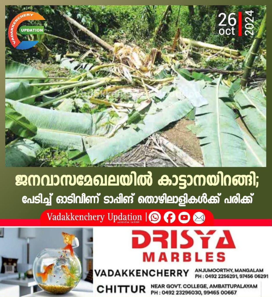 നെല്ലിയാമ്പതി വനമേഖലയിൽനിന്നെത്തിയ കാട്ടാന വ്യാപകമായി കൃഷി നശിപ്പിച്ചു. ടാപ്പിങ്ങിന് പോയ തൊഴിലാളികൾ ആനയ്ക്ക് മുന്നിലകപ്പെട്ടതിനെത്തുടർന്ന് ഓടുന്നതിനിടെ വീണ് പരിക്കേറ്റു. ടാപ്പിങ് തൊഴിലാളികളായ ഒലിപ്പാറ പടിഞ്ഞാറേ വാടിയിൽ മിനി ജോസഫ് (33), വരിക്കപ്പുള്ളി ബിനോജ് ജോസഫ് (29) എന്നിവർക്കാണ് പരിക്കേറ്റത്. ഇവർ ആദ്യം അടിപ്പെരണ്ടയിലെ സ്വകാര്യ ആശുപത്രിയിലും പിന്നീട് നെന്മാറ സാമൂഹ്യാരോഗ്യകേന്ദ്രത്തിലും ചികിത്സ തേടി. വെള്ളിയാഴ്ച പുലർച്ചെ 5.30-നാണ് സംഭവം. ഇവർ സഞ്ചരിച്ച ഇരുചക്രവാഹനവും ആന തകർത്തു.