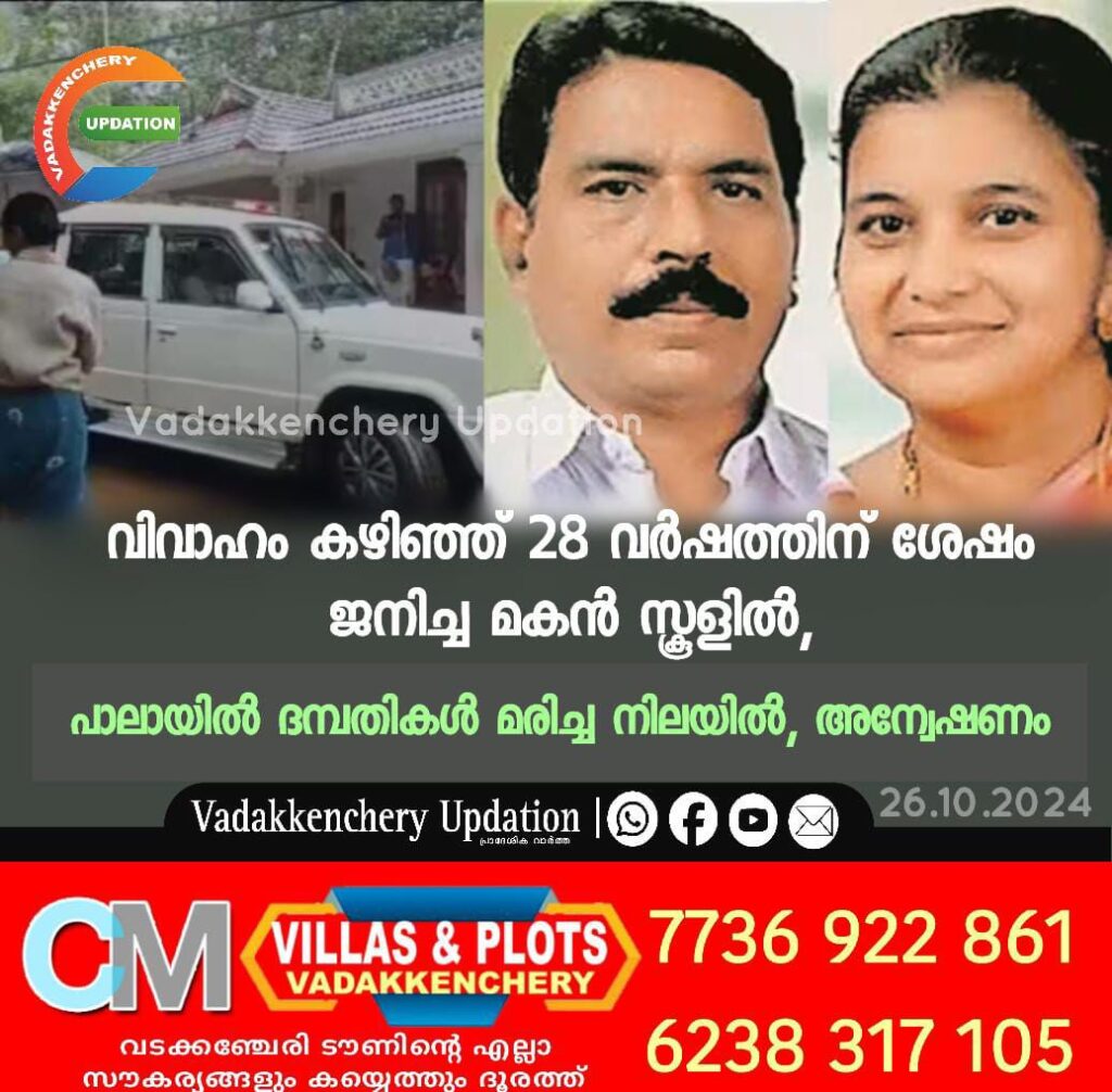 വിവാഹം കഴിഞ്ഞ് 28 വർഷത്തിന് ശേഷം ജനിച്ച മകൻ സ്കൂളിൽ, പാലായിൽ ദമ്പതികൾ മരിച്ച നിലയിൽ, അന്വേഷണം