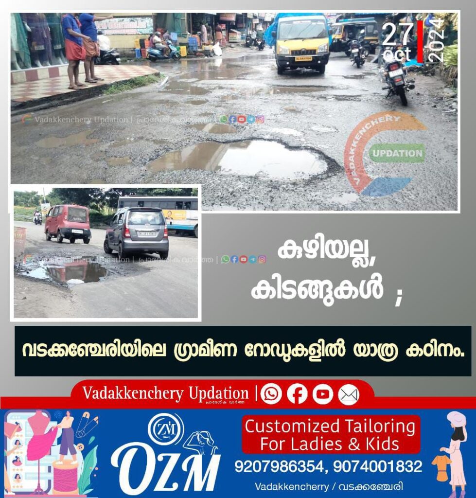 കുഴിയല്ല, കിടങ്ങുകൾ ; വടക്കഞ്ചേരിയിലെ ഗ്രാമീണ റോഡുകളിൽ യാത്ര കഠിനം.