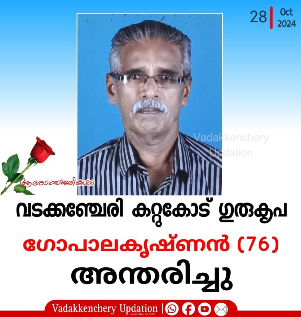 വടക്കഞ്ചേരി കറ്റുകോട് ഗുരുകൃപ ഗോപാലകൃഷ്ണൻ (76) അന്തരിച്ചു. സംസ്ക്കാരം ഇന്ന് (28.10.2024) നാലു മണിക്ക് തിരുവില്വാമല ഐവർമഠത്തിൽ നടക്കും. അച്ഛൻ : പൊന്നു. ഭാര്യ പ്രേമാവതി ( റിട്ട.CI of Police). മക്കൾ : ദിവ്യ, ധന്യ. മരുമകൻ : സുധിർകുമാർ ( SBI ) സഹോദരൻ : രാഘവൻ (Late) , സഹോദരി : രുഗ്മണി.