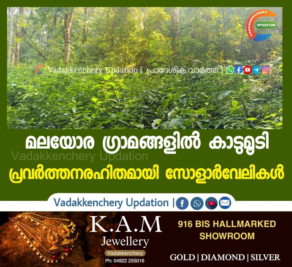 വള്ളിപടർപ്പുകളും കാടുംമൂടി പ്രവർത്തനരഹിതമായ വനാതിർത്തികളിലെ സോളാർവേലികൾ പ്രവർത്തിപ്പിക്കാൻ അടിയന്തരനടപടി ഉണ്ടാകണമെന്ന് നാട്ടുകാർ.കിഴക്കഞ്ചേരി പഞ്ചായത്തില് വനാതിർത്തികളിലുള്ള സോളാർവേലികള് പല ഭാഗത്തും വള്ളിപടർപ്പുകള് കയറി പ്രവർത്തനക്ഷമമല്ല. കണിച്ചിപരുതയില് നിന്നും പാലക്കുഴിമലയിലേക്കുള്ള റോഡിന്റെ അതിർത്തി പങ്കിടുന്ന പീച്ചി വനാതിർത്തിയിലെ ഫെൻസിംഗ് വള്ളികള് പടർന്ന് പ്രവർത്തിക്കുന്നില്ല. ഇതിനാല് ഏത് സമയവും പീച്ചി കാട്ടില്നിന്നും ആനകള് കൂട്ടത്തോടെ കൃഷിയിടങ്ങളിലെത്താൻ സാധ്യതയുണ്ട്. കൃഷിയിടങ്ങളിലെ തീറ്റ കണ്ടാല് പിന്നെ ആനകളുടെ വരവ് കൂടും. ഫെൻസിംഗ് കാര്യക്ഷമമായാലും അത് തകർത്തും ആനകളെത്തും.