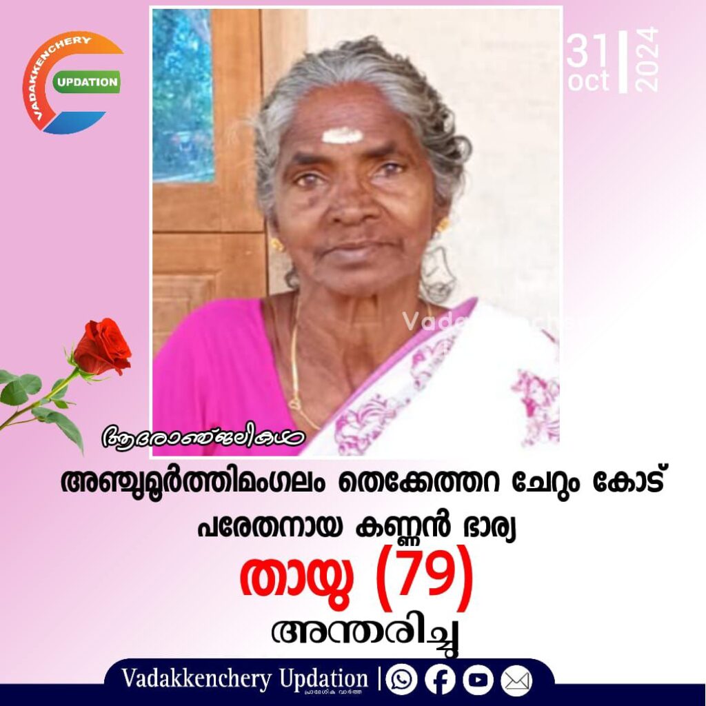 അഞ്ചുമൂർത്തിമംഗലം തെക്കേത്തറ ചേറും കോട് പരേതനായ കണ്ണൻ ഭാര്യ തായു (79) അന്തരിച്ചു. സംസ്ക്കാരം നാളെ (01.11.2024-വെള്ളി ) രാവിലെ 11 മണിക്ക് തിരുവില്വാമല ഐവർ മഠം ശ്മശാനത്തിൽ