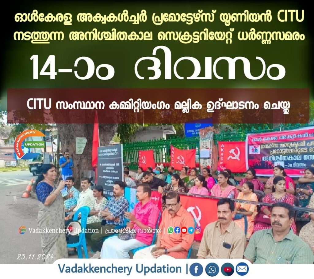 ഓൾകേരള അക്വകൾച്ചർ പ്രമോട്ടേഴ്സ് യൂണിയൻ CITU നടത്തുന്ന അനിശ്ചിതകാല സെക്രട്ടറിയേറ്റ് ധർണ്ണസമരം 14-ാം ദിവസം – CITU സംസ്ഥാന കമ്മിറ്റിയംഗം മല്ലിക ഉദ്ഘാടനം ചെയ്തു. യൂണിയൻ ജനറൽ സെക്രട്ടറി എം ഹരിദാസ് , ട്രഷറർ പി എം ശശികുമാർ ,കെ മുരളി ,നൗഫൽ , പ്രവീൺ ,അരുൺകുമാർ ,വിനോദ് , പ്രമോദ് ഉണികൃഷ്ണൻ ,ഷെമീം , ഷിബി , വിദ്യ , അനിൽകുമാർ എന്നിവർ സംസാരിച്ചു.
