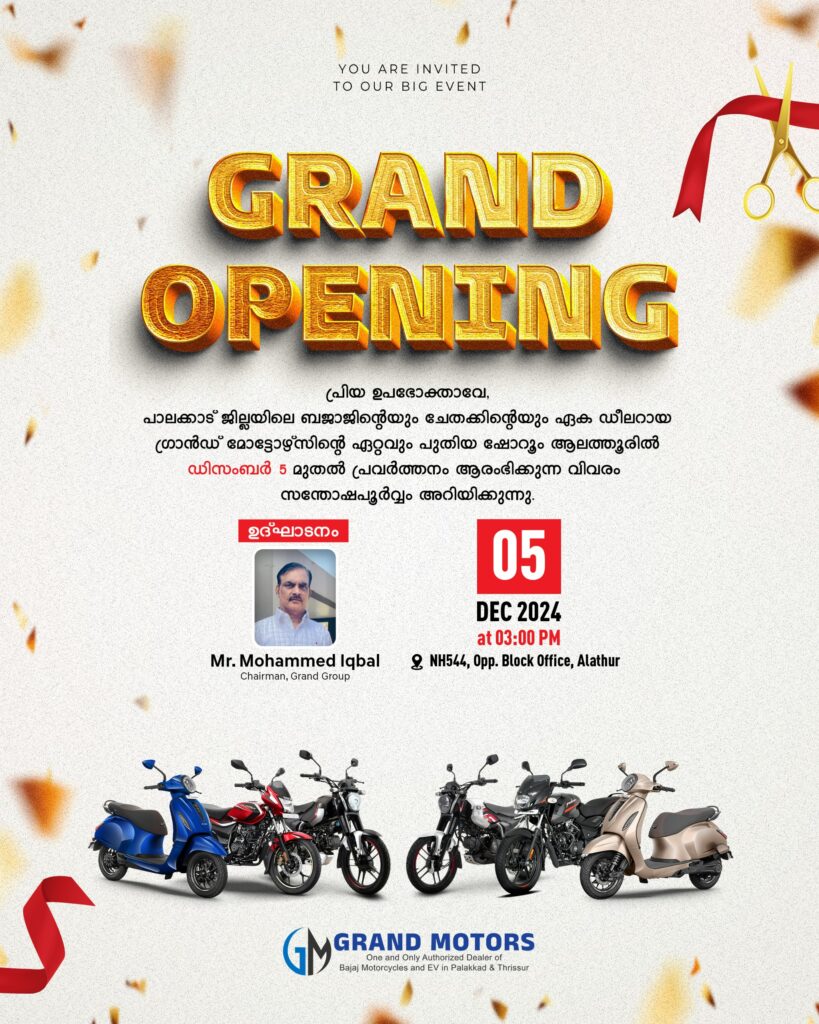 പാലക്കാട് ജില്ലയിലെ ബജാജിന്റെയും ചേതക്കിന്റെയും ഏക ഡീലറായ ഗ്രാൻഡ് മോട്ടോഴ്സിന്റെ ഏറ്റവും പുതിയ ഷോറൂമും & സർവീസ് ഔട്ട്ലെറ്റും ആലത്തൂരിൽ ഡിസംബർ 5 മുതൽ പ്രവർത്തനം ആരംഭിക്കുന്ന വിവരം സന്തോഷപൂർവ്വം അറിയിക്കുന്നു.❇️