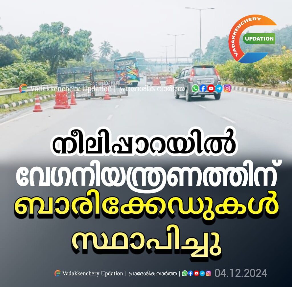 വടക്കഞ്ചേരി-മണ്ണുത്തി ദേശീയപാതയിൽ നീലിപ്പാറയിലുള്ള യൂ ടേണിൽ വാഹനങ്ങളുടെ വേഗംനിയന്ത്രിക്കാൻ പോലീസ് ബാരിക്കേഡുകൾ സ്ഥാപിച്ചു. തുടർച്ചയായുള്ള അപകടങ്ങളെത്തുടർന്നാണ് നടപടി. പാലക്കാട് ദിശയിലേക്കുള്ള പാതയിലാണ് വേഗനിയന്ത്രണം.