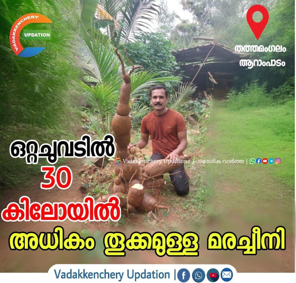 തത്തമംഗലം ആറാംപാടത്താണ് ഒറ്റചുവടിൽ ഏകദേശം 30 കിലോ വരുന്ന മരച്ചീനി ലഭിച്ചത്. ഗണേശൻ്റെ (കോൺട്രാക്ടർ) കൃഷി സ്ഥലത്തുനിന്നുമാണ് ഈ കപ്പ ലഭിച്ചത്. 20 സെൻറ് സ്ഥലത്ത് ഒഴിവുസമയങ്ങളിൽ വീട്ടിലേക്ക് വേണ്ട ആവശ്യത്തിനുള്ള കൃഷികൾ ആണ് ചെയ്യുന്നത്. അങ്ങനെ ചെയ്ത കൃഷിയിൽ നിന്നാണ് 30 കിലോയിൽ അധികം തൂക്കം വരുന്ന മരച്ചീനി ലഭിച്ചത്. മരച്ചീനി കൂടാതെ പച്ചക്കറികളും തെങ്ങ് , വാഴ തുടങ്ങിയവയും കൃഷിചെയ്യുന്നുണ്ട്