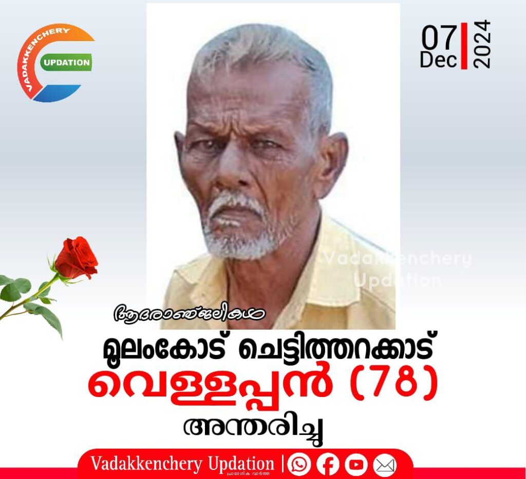 മൂലംകോട് ചെട്ടിത്തറക്കാട് വെള്ളപ്പൻ (78) അന്തരിച്ചു.സംസ്കാരം ഇന്ന് (07.12.2024- ശനി ) രാവിലെ 10 മണിക്ക് ചെട്ടിത്തറക്കാട് ശ്മശാനത്തിൽ. ഭാര്യ ചെല്ല, മകൻ ഗോപാലൻ സഹോദരങ്ങൾ നാരായണൻ, വെള്ളച്ചി, പാർവതി, മാധവി, കമലം,പരേതരായ വേലായുധൻ, ദേവി