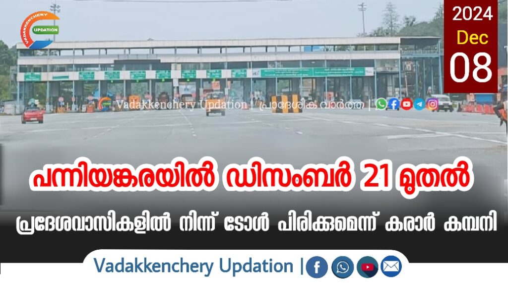പന്നിയങ്കരയിൽ പ്രദേശവാസികളിൽ നിന്ന് ടോൾ പിരിക്കാനുള്ള തീരുമാനത്തിൽ നിന്ന് ഒരുകാരണവശാലും പിന്നോട്ടില്ലെന്നും ഡിസംബർ 21 മുതൽ പ്രദേശവാസികളിൽ നിന്ന് ടോൾ പിരിക്കുമെന്നും കരാർ കമ്പനി അധികൃതർ. 6ഡിസംബർ 20 ന് സ്ഥലം എം എൽ എ, പാലക്കാട്, തൃശൂർ ജില്ലാ കളക്ടർമാർ, ടോൾ കരാർ കമ്പനി എന്നിവരുടെ യോഗം വിളിച്ചിട്ടുണ്ട്. എം എൽ എ പറഞ്ഞതനുസരിച്ചാണ് അഞ്ചു മുതൽ തുടങ്ങനിരുന്ന ടോൾ മാറ്റിവച്ചത്. ഇരുപതിന് തീരുമാനം ഉണ്ടായില്ലെങ്കിൽ 21 മുതൽ പ്രദേശവാസികളിൽ നിന്ന് ടോൾ പിരിക്കാതെ മറ്റ് മാർഗമില്ലെന്നും കമ്പനി ടോൾ പ്ലാസ മാനേജർ മുകുന്ദൻ പറഞ്ഞു.