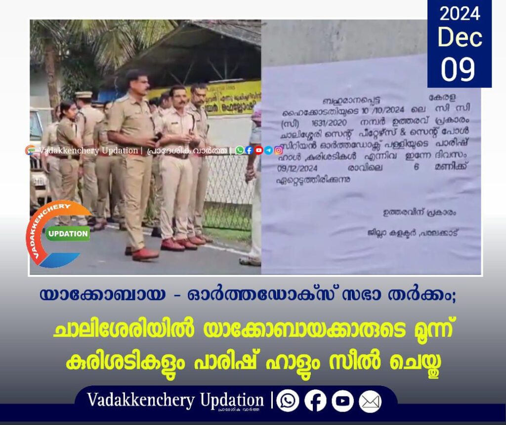യാക്കോബായ – ഓർത്തഡോക്സ് സഭാ തർക്കത്തിൽ സഭാ തർക്കം മൂന്ന് കുരിശടികളും, പാരിഷ് ഹാളും സീൽചെയ്തു. ചാലിശേരിയിൽ യാക്കോബായ വിഭാഗം കൈവശം വെച്ചിരുന്ന വസ്തുക്കളാണ് സീൽ ചെയ്തത്. പൊലീസിൻ്റെ സഹായത്തോടെ ജില്ലാഭരണകൂടമാണ് നടപടി സ്വീകരിച്ചത്. ഹൈക്കോടതി നിർദ്ദേശത്തെ തുടർന്ന് പാലക്കാട് ജില്ലാ കളക്ടറുടെ നിർദ്ദേശ പ്രകാരം ഒറ്റപ്പാലം സബ് കലക്ടർ മിഥുൻ പ്രേമരാജിൻ്റെ നേതൃത്വത്തിൽ റവന്യു ഉദ്യോഗസ്ഥരും നൂറോളം പോലീസ് ഉദ്യോഗസ്ഥരും ചേർന്ന് നടപടികൾ പൂർത്തിയാക്കി. കുരിശടികളിലെയും പാരീഷ് ഹാളിലെയും പൂട്ടുകൾ സീൽ ചെയ്തു നോട്ടീസ് പതിച്ചു. ഒക്ടോബറിൽ ഇതേ നടപടിക്ക് വലിയ സന്നാഹവുമായി പൊലീസ് വന്നിരുന്നു. എന്നാൽ വിശ്വാസികളുടെ എതിർപ്പിനെ തുടർന്ന് പിന്മാറുകയായിരുന്നു. ഇന്ന് പ്രതിഷേധമുണ്ടായില്ല.