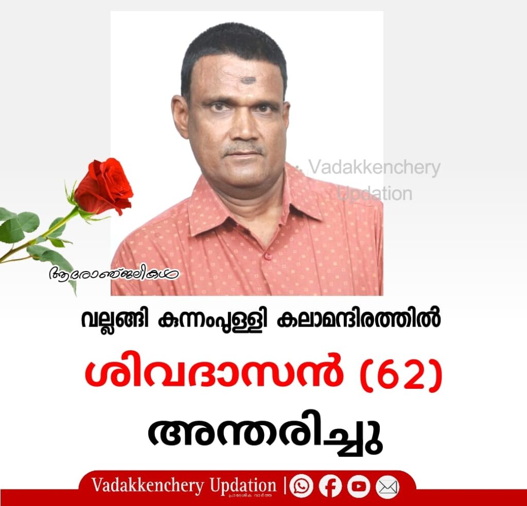 വല്ലങ്ങി കുന്നംപുള്ളി കലാമന്ദിരത്തിൽ പരേതരായ വേലുക്കുട്ടി പണിക്കരുടെയും വേശു അമ്മയുടെയും മകൻ വി ശിവദാസൻ (62) അന്തരിച്ചു. സംസ്ക്കാരം ഇന്ന് (11.12.2024 ബുധനാഴ്ച )കാലത്ത് 10 മണിക്ക് വല്ലങ്ങി സമുദായ ശ്മശാനത്തിൽ. സഹോദരങ്ങൾ: പരേതനായ കലാധരൻ, കല്യാണവാസു, വിജയൻ, പരേതനായ രാജേഷ്. സഹോദരി :ഉഷ