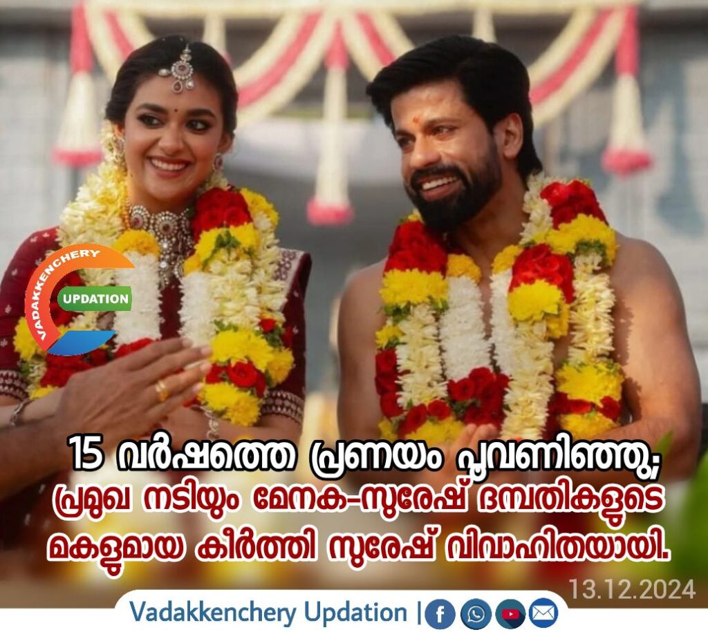 15 വർഷത്തെ പ്രണയം പൂവണിഞ്ഞു. പ്രമുഖ നടിയും മേനക-സുരേഷ് ദമ്പതികളുടെ മകളുമായ കീർത്തി സുരേഷ് വിവാഹിതയായി. നടൻ ആന്റണി തട്ടിലാണ് കീർത്തിയുടെ ജീവിതപങ്കാളി. ഗോവയിലെ ഒരു അന്തർദ്ദേശീയ റിസോർട്ടിൽ വച്ച് അടുത്ത ബന്ധുക്കളുടെയും സുഹൃത്തുക്കളുടെയും സാന്നിധ്യത്തിൽ വിവാഹ ചടങ്ങുകൾ നടന്നു.