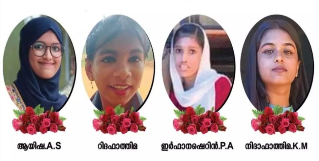 ഇന്നലെ വൈകിട്ട് 3.45നായിരുന്നു സംഭവം. ഇര്ഫാന, നിദ, റിദ, ആയിഷ എന്നിവരാണ് മരിച്ചത്. പരീക്ഷ കഴിഞ്ഞ് മടങ്ങുകയായിരുന്ന വിദ്യാര്ത്ഥികളുടെ ദേഹത്തേയ്ക്ക് നിയന്ത്രണംവിട്ടുവന്ന സിമന്റ് ലോറി മറിയുകയായിരുന്നു. നാല് പേരെയും ആശുപത്രിയില് എത്തിച്ചെങ്കിലും മരണം സംഭവിച്ചിരുന്നു. വിദ്യാര്ഥികളുടെ മരണത്തില് മുഖ്യമന്ത്രി പിണറായി വിജയന് അനുശോചനം രേഖപ്പെടുത്തിയിരുന്നു. സംഭവം ഞെട്ടിക്കുന്നതും ദാരുണവുമാണെന്ന് മുഖ്യമന്ത്രി പറഞ്ഞു.