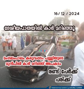 ദേശീയപാതയിൽ മംഗലംപാലം കരുവപ്പടം പള്ളിയുടെ മുൻപിൽ കാർ മറിഞ്ഞ് അപകടം . കാർ തലകീഴായ് മറിഞ്ഞു കാറിൽ ഉണ്ടായ രണ്ട് പേർക്കും പരിക്ക് ഉണ്ട്. പാലക്കാട് ദിശയിലേക്ക് പോകുന്ന ട്രാക്കിലാണ് സംഭവം നടന്നത് . ഓടിക്കൂടിയ നാട്ടുകാർ ഉടൻ തന്നെ ആംബുലൻസ് വിളിച്ച് പരിക്ക് പറ്റിയ വരെ അശുപത്രിയിലേക്ക് കൊണ്ടു പോയി. വടക്കഞ്ചേരി ചീരക്കുഴി അഷ്റഫ്, പാലക്കുഴി സ്വദേശി ജോമോൻ എന്നിവർക്കാണ് പരിക്കേറ്റത് .നിയന്ത്രണം വിട്ട പല തവണ മറിഞ്ഞതായി നാട്ടുകാർ പറഞ്ഞു. അപകടം ഉണ്ടാവാനുള്ള കാരണം വ്യക്തമല്ല