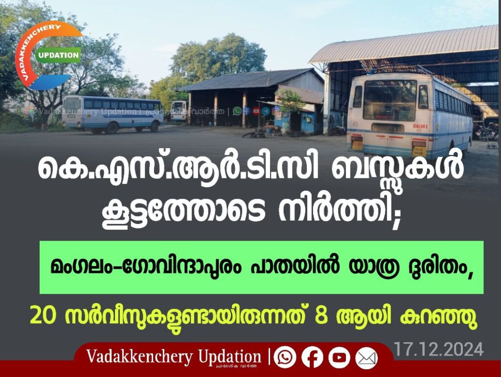 തുടക്കത്തില് മികച്ച വരുമാനം ലഭിച്ചിരുന്നതും ലാഭകരമായി സര്വീസ് നടത്തിയിരുന്ന റൂട്ടുകളായിരുന്ന മംഗലം-ഗോവിന്ദാപുരം പാതയിലെ കെ.എസ്.ആര്.ടി.സി. ബസ്സുകള്. പലപ്പോഴായി സ്വകാര്യ ബസ്സുകാരുടെ സമ്മര്ദത്തിന് വഴങ്ങിയും സമയക്രമീകരണത്തിലെ അപാകതയും മൂലം ചില സര്വീസുകള് നഷ്ടത്തിലേക്ക് നീങ്ങി. ഇതിന്റെ പേരില് തുടക്കത്തില് എട്ട് സര്വീസുകള് നിര്ത്തി 12 എണ്ണമാണ് ഇപ്പോള് സര്വീസ് നടത്തുന്നത്. പിന്നീട് പലപ്പോഴായി നാല് സര്വീസുകള് കൂടി നിര്ത്തിയതോടെ നിലവില് എട്ടു സര്വീസുകള് മാത്രമാണ് ഈ റൂട്ടിലോടുന്നത്. ഇതില് നാല് ബസ്സുകളുടെ ഷെഡ്യൂളുകള് വെട്ടിക്കുറയ്ക്കുകയും ചെയ്തതോടെ വടക്കഞ്ചേരി ഡിപ്പോയുടെ നിലനില്പ്പുതന്നെ ഭീഷണിയിലായെന്ന് കെ.എസ്.ആര്.ടി.സി. ജീവനക്കാര് പറയുന്നു. എന്നാല് വരുമാനം കുറഞ്ഞതുമൂലമാണ് ബസ്സിന്റെ സര്വീസുകളുടെ എണ്ണം കുറച്ചതെന്നാണ് കെ.എസ്.ആര്.ടി.സി. അധികൃതര് പറയുന്നത്.