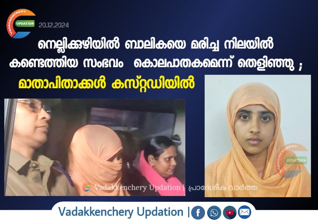 കോതമംഗലം നെല്ലിക്കുഴിയില് ഉത്തര്പ്രദേശ് സ്വദേശിനിയായ ആറ് വയസുകാരിയെ വീടിനുള്ളില് മരിച്ച നിലയില് കണ്ടെത്തിയ സംഭവം കൊലപാതകമെന്ന് തെളിഞ്ഞു.പെണ്കുട്ടിയെ ശ്വാസംമുട്ടിച്ച് കൊലപ്പെടുത്തിയതാണെന്നാണ് സൂചന. പെണ്കുട്ടിയുടെ പിതാവ് അജാസ് ഖാനെയും മാതാവിനേയും പൊലീസ് കസ്റ്റഡിയില് എടുത്തു.നെല്ലിക്കുഴി ഇരുമലപ്പടിക്ക് സമീപം വാടകയ്ക്ക് താമസിക്കുകയായിരുന്നു അജാസ് ഖാനും കുടുംബവും. വ്യാഴം രാവിലെയാണ് ആറ് വയസുകാരി മുസ്കാനെ വീടിനുള്ളില് മരിച്ച നിലയില് കണ്ടെത്തിയത്. തുടര്ന്ന് അജാസ് ഖാന് പൊലീസില് വിവരം അറിയിക്കുകയായിരുന്നു. പൊലീസും ഫോറന്സിക് സംഘവും സ്ഥലത്തെത്തി വിശദമായി പരിശോധന നടത്തിയിരുന്നു.ബുധനാഴ്ച രാത്രി ഭക്ഷണം കഴിച്ച് കിടന്ന മകളെ മരിച്ച നിലയിൽ കണ്ടെത്തുകയായിരുന്നു എന്നാണ് അജാസ് ഖാൻ പൊലീസിനോട് പറഞ്ഞത്. പോസ്റ്റ്മോര്ട്ടത്തിലാണ് പെണ്കുട്ടിയെ കൊലപ്പെടുത്തിയതാണെന്ന സൂചന ലഭിച്ചിരിക്കുന്നത്.മരിച്ച കുട്ടിയുടെ മാതാപിതാക്കളെ പോലീസ് കസ്റ്റഡിയിൽ എടുത്ത് ചോദ്യം ചെയ്തുവരികയാണ്