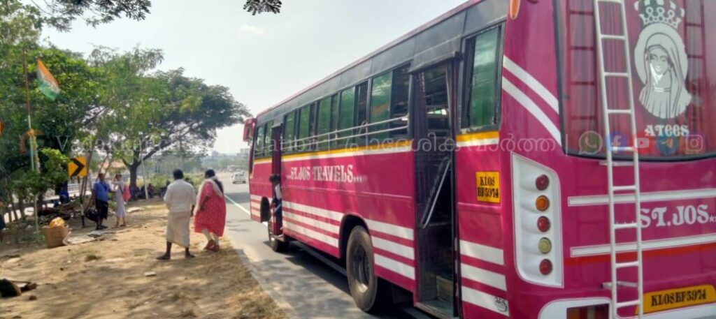 മംഗലം പാലം സ്റ്റോപ്പിൽ സ്വകാര്യ ബസ്സ് നിർത്തി യാത്രക്കാരെ കയറ്റുന്നു.