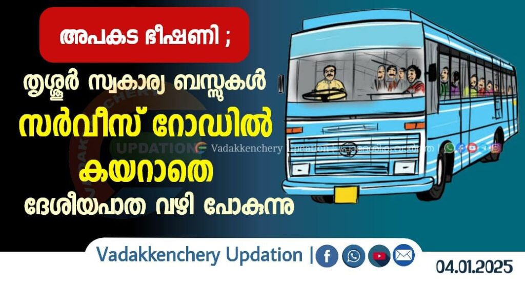 വടക്കഞ്ചേരി ; തൃശ്ശൂർ ഭാഗത്തേക്കുള്ള സ്വകാര്യ ബസ്സുകൾ സർവീസ് റോഡിൽ കയറാതെ ദേശീയപാത വഴി പോകുന്നത് ഗുരുതര അപകടഭീഷണി ഉയർത്തുന്നു.
