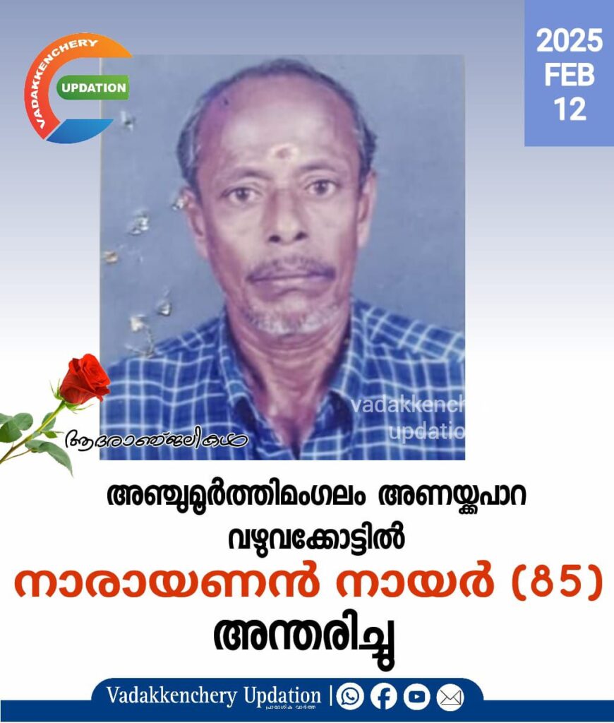 വഴുവാക്കോട് നാരായണൻ നായർ (ഓട്ടോ പ്രവാസി )മണിയുടെ അച്ഛൻ അന്തരിച്ചു.സംസ്ക്കാരം ഇന്ന് (12-2-25 ബുധൻ) രാവിലെ 11 മണിക്ക് തിരുവില്വാമല ഐവർമഠത്തിൽ. ഭാര്യ :വേശമ്മാളു.മക്കൾ: മണികണ്ഠൻ,സുഭാഷ്, അജിത.മരുമക്കൾ: സുധീർ,രമ്യ.സഹോദരങ്ങൾ: കൃഷ്ണൻ നായർ,വേണു നായർ.