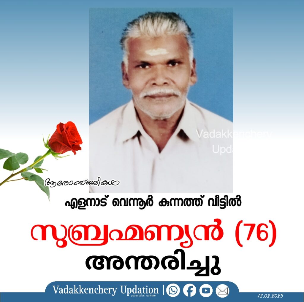 എളനാട് വെന്നൂർ കുന്നത്ത് വീട്ടിൽ സുബ്രഹ്മണ്യൻ (76) അന്തരിച്ചു. സംസ്ക്കാരം നാളെ ( 13.02.2025 ) കാലത്ത് 10 മണിക്ക് ഐവർമഠത്തിൽ. ഭാര്യ : രുഗ്മണി ,മക്കൾ :രജനി, രേഖ, രജിത, രതീഷ്. മരുമക്കൾ (late ) ശിവദാസ്, മുരളി, ജയൻ, രാജി .