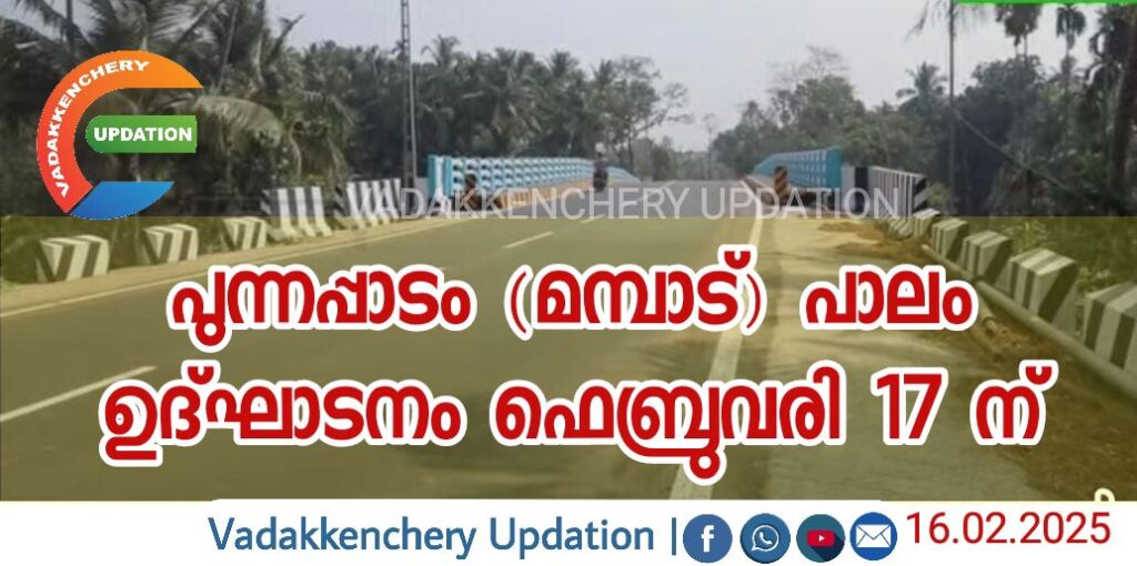 ജില്ലാ പാതയായ കുണ്ടുകാട് ചിറ്റടി റോഡിൽ പൂർത്തീകരിച്ച പുന്നപ്പാടം (മമ്പാട്) പാലത്തിൻ്റെ ഉദ്ഘാടനം 2025 ഫെബ്രുവരി 17 തിങ്കൾ വൈകുന്നേരം 6.30 ന് പുന്നപ്പാടം പാലം പരിസരത്ത് വെച്ച് പൊതുമരാമത്ത്, വിനോദ സഞ്ചാര വകുപ്പ് മന്ത്രി പി.എ.മുഹമ്മദ്റിയാസ് നിർവഹിക്കും.ആലത്തൂർ എം.എൽ.എ കെ.ഡി പ്രസേനൻ അദ്ധ്യക്ഷത വഹിക്കുന്ന ചടങ്ങിൽ