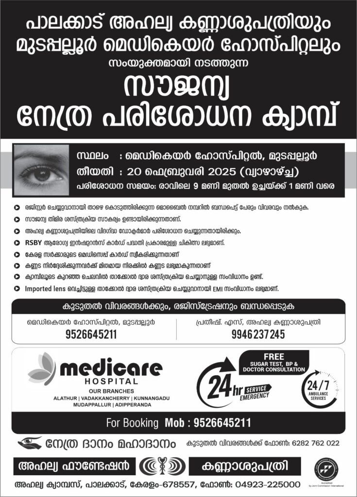 ▪️അഹല്യ കണ്ണാശുപത്രിയിലെ വിദഗ്ദ്ധ ഡോക്ടർമാർ പരിശോധന ചെയ്യുന്നതായിരിക്കും.
