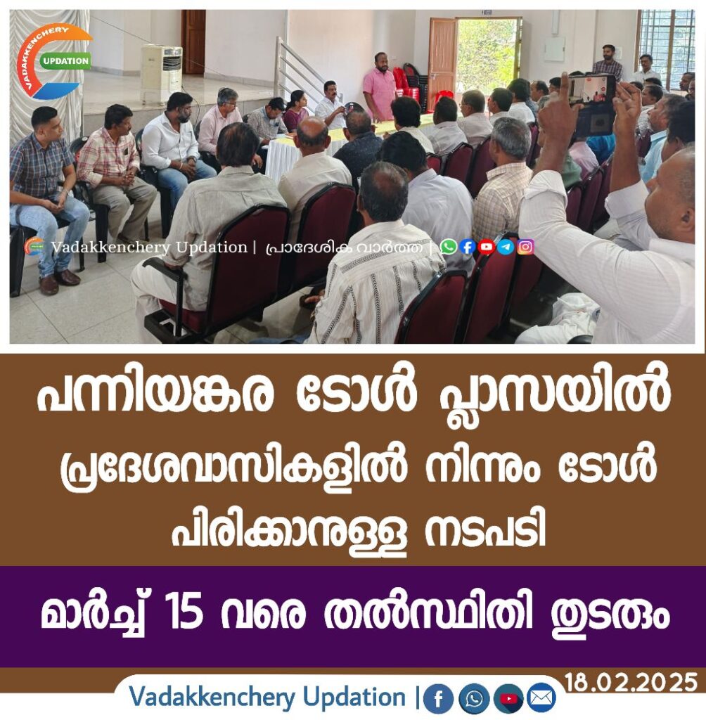 പന്നിയങ്കര ടോൾ പ്ലാസയിൽ പ്രദേശവാസികളിൽ നിന്നും ടോൾ പിരിക്കാൻ ഉള്ള കരാർ കമ്പനിയുടെ നടപടിയുമായി ബന്ധപ്പെട്ടു കൊണ്ട് തരൂർ എംഎൽഎ പി.പി സുമോദിൻ്റെയും ആലത്തൂർ എംപി രാധാകൃഷ്ണൻ്റേയും നേതൃത്വത്തിൽ നടന്ന രാഷ്ട്രീയ സർവ്വകക്ഷി യോഗത്തിൽ മാർച്ച് 15 വരെ തൽസ്ഥിതി തുടരുവാനും ഇത് സംബന്ധിച്ച തുടർനടപടികൾക്ക് 6 അംഗ സബ് കമ്മിറ്റി രൂപീകരിക്കുവാനും തീരുമാനിച്ചു .യോഗത്തിൽ ആലത്തൂർ എംഎൽഎ കെ.ഡി. പ്രസേനൻ , പാലക്കാട് ജില്ലാ കളക്ടർ ജി.പ്രിയങ്ക, ആലത്തൂർ DYSP ,NHAI പ്രതിനിധികൾ, കരാർ കമ്പനി പ്രതിനിധികൾ വിവിധ രാഷ്ട്രീയ കക്ഷി പ്രതിനിധികൾ, സംയുക്ത സമരസമിതി പ്രതിനിധികൾ,വ്യാപാര സംഘടന പ്രതിനിധികൾ, ഓട്ടോ ടാക്സി യൂണിയൻ അംഗങ്ങൾ എന്നിവർപങ്കെടുത്തു.