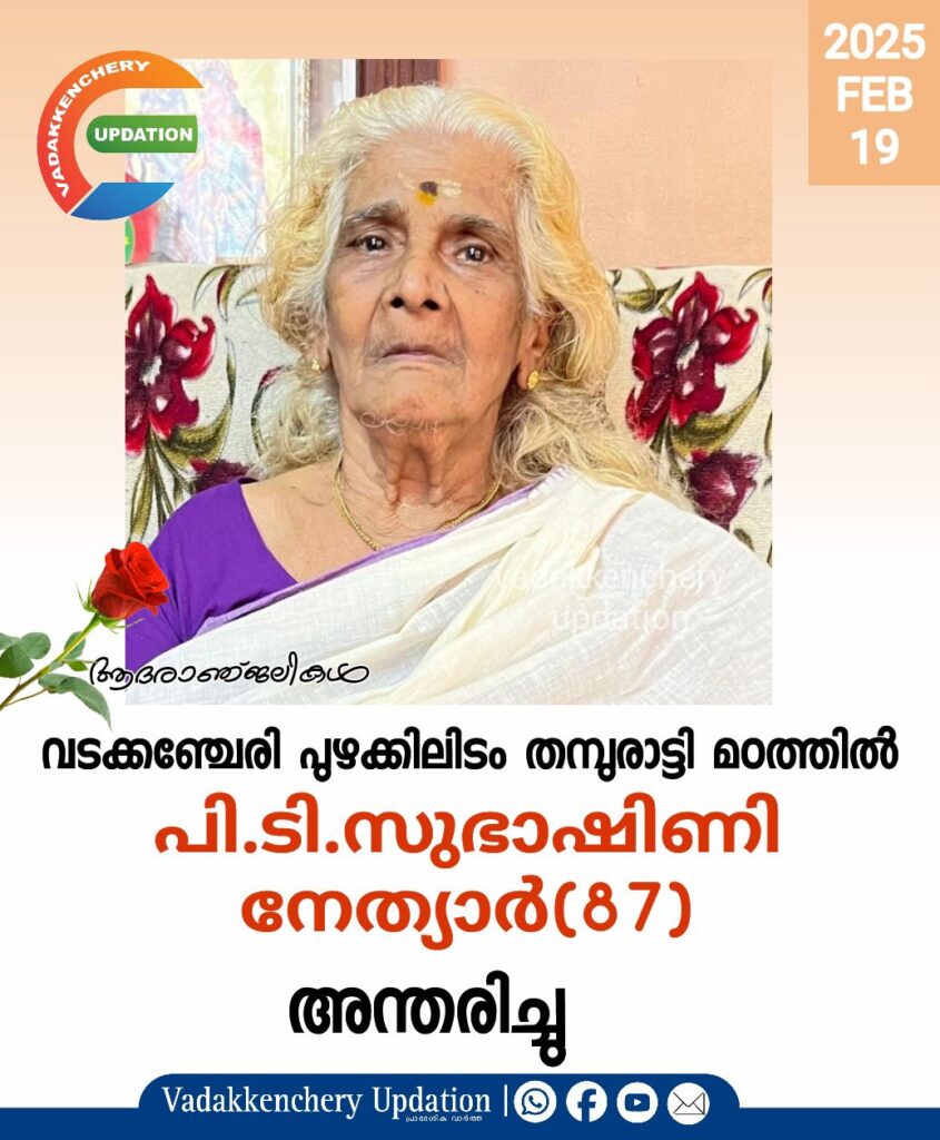തമ്പുരാട്ടി മഠത്തിൽ പി.ടി.സുഭാഷിണി നേത്യാർ (87) അന്തരിച്ചു. സംസ്കാരം ഇന്നു(19.02.2025) 10 മണിക്ക് ഭർത്താവ്: എ.ബി.ഗോവിന്ദ മേനോൻ (late)