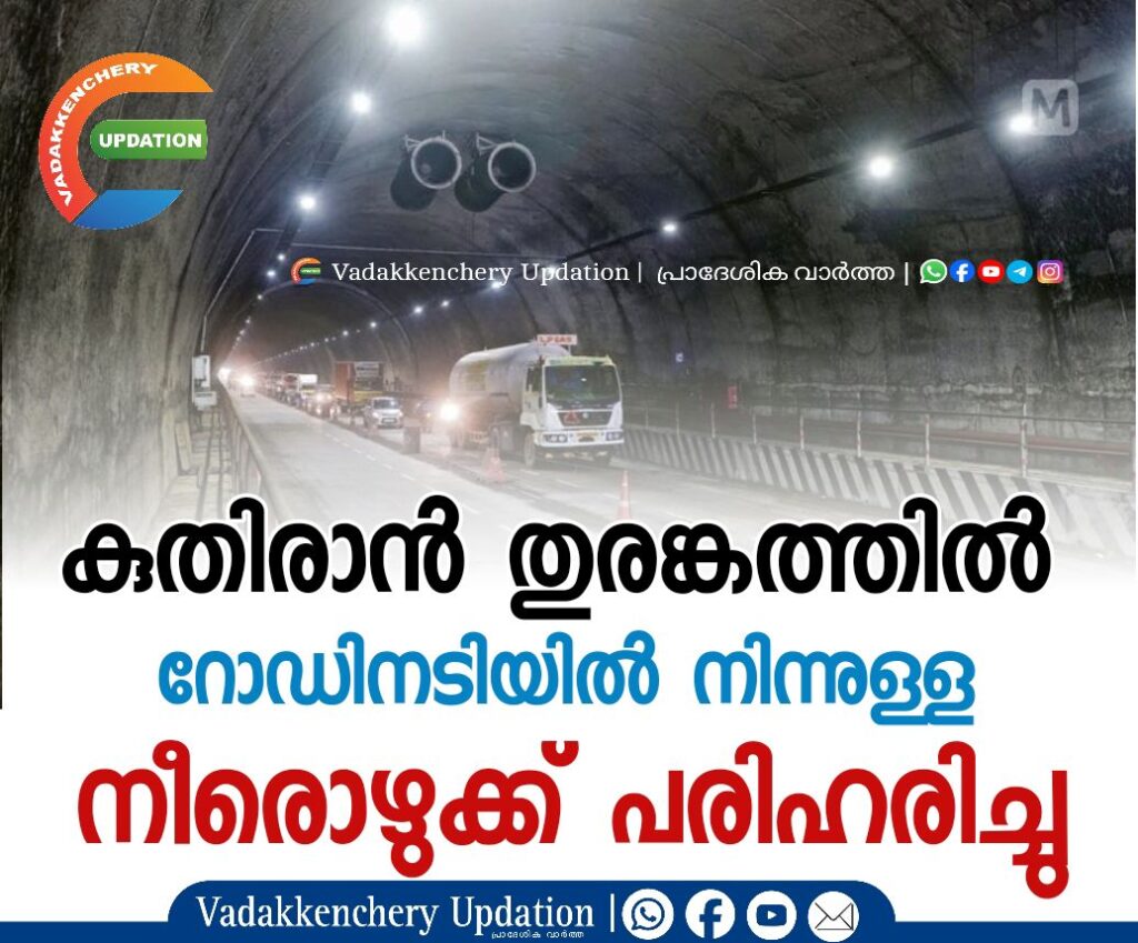 ഒരു വർഷത്തിലേറെയുള്ള കാത്തിരിപ്പിനൊടുവിൽ കുതിരാൻ വലതുതുരങ്കത്തിലെ റോഡിലുണ്ടായിരുന്ന നീരൊഴുക്ക് പരിഹരിച്ചു. റോഡിനടിയിൽനിന്നുള്ള ഉറവയിൽനിന്നാണു വെള്ളം പുറത്തേക്കൊഴുകിയിരുന്നത്. ഇതു പെട്ടെന്നു ശ്രദ്ധയിൽപ്പെടാത്തതിനാൽ ഇരുചക്രവാഹനയാത്രിക്കാർക്കു ഭീഷണിയായിരുന്നു. ഉറവ വരുന്ന ഭാഗത്ത് ചെളി രൂപപ്പെട്ടതോടെ വാഹനം തെന്നുന്ന സ്ഥിതിയായിരുന്നു.
