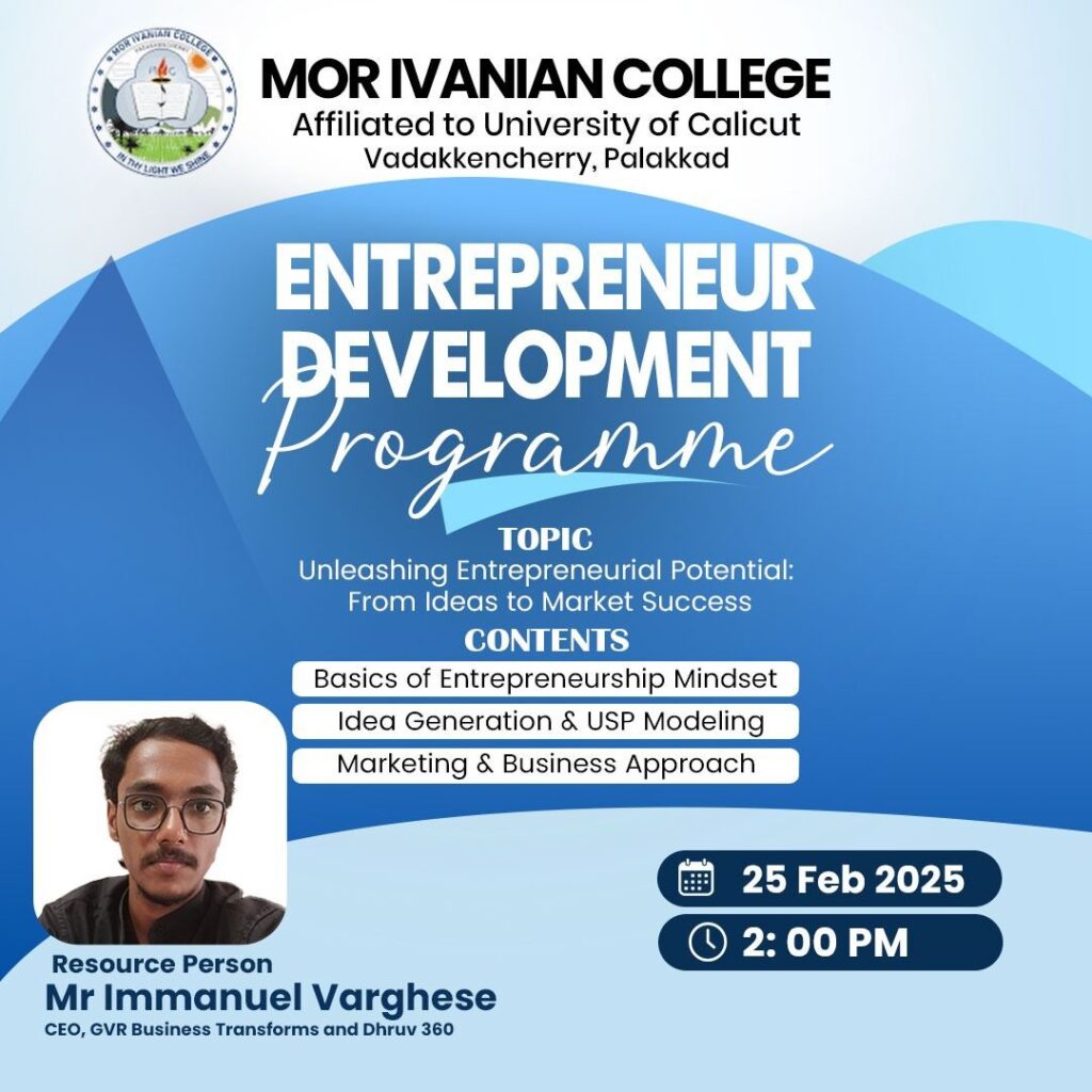 വടക്കഞ്ചേരി മോർ ഇവാനിയൻ കോളേജിൽ ഇന്ന് ഉച്ചക്ക് 1.30 ന് സംരംഭകത്വ സെമിനാർ നടത്തുന്നു. ജി വി ആർ ബിസിനസ്സ് ട്രാസ്ഫോംസിന്റെ സിഇഒ ശ്രീ ഇമ്മാനുവൽ വർഗീസാണ് സംരംഭകത്വ സെമിനാർ നയിക്കുന്നത്. ആശയങ്ങളെ എങ്ങനെ പുതിയ സംരംഭങ്ങളാക്കി മാറ്റാം എന്നും ഇന്നത്തെ മത്സരാധിഷ്ഠിത ലോകത്ത് പുതിയ ബിസിനസ്സ് തന്ത്രങ്ങളിലൂടെ എങ്ങനെ വിജയം കൈവരിക്കാമെന്നും ഈ സെമിനാറിലൂടെ മനസ്സിലാക്കാം.