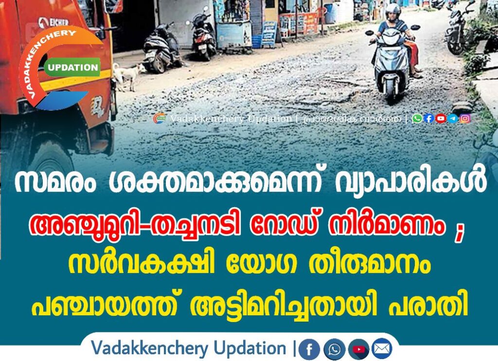 തകർന്നു കിടക്കുന്ന പുതുക്കോട് പഞ്ചായത്തിലെ അഞ്ചുമുറി-തച്ചനടി റോഡിന്റെ നിർമാണം ശനിയാഴ്ച തുടങ്ങുമെന്ന പ്രഖ്യാപനം നടന്നില്ല. സർവകക്ഷി യോഗ തീരുമാനം പഞ്ചായത്ത് അധികൃതർ അട്ടിമറിച്ചതായി വ്യാപാരികളും കോൺഗ്രസ് പ്രവർത്തകരും ആരോപിച്ചു. ശനിയാഴ്ച മുതൽ റോഡ് ബ്ലോക്ക് ചെയ്ത് നിർമാണം നടത്തുമെന്നാണ് അറിയിച്ചിരുന്നത്. എന്നാൽ കരാറുകാരൻ അസുഖമായതിനാൽ ആശുപത്രിയിലാണെന്നും വന്നാലുടൻ പണി തുടങ്ങുമെന്നുമാണ് ബന്ധപ്പെട്ടവർ പറയുന്നത്. നാല് വർഷമായിട്ടും റോഡ് നന്നാക്കിയിട്ടില്ലെന്നും പൊടിശല്യം രൂക്ഷമാണെന്നും റോഡിൻ്റെ തകർച്ച മൂലം മിക്ക ബസുകളും വൈകുന്നേരങ്ങളിൽ അഞ്ചുമുറിയിലേക്ക് വരാതെ തച്ചനടിയിൽ നിന്നും തിരിച്ചു പോകുകയാണെന്നും നാട്ടുകാർ പറഞ്ഞു.