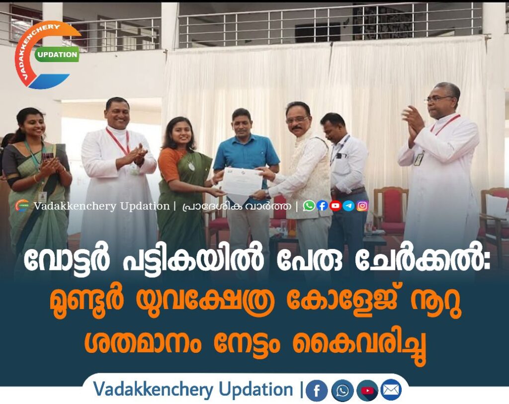 വോട്ടര് പട്ടികയില് പേരു ചേര്ക്കലില് (ഇലക്ടറല് റോള് എന്റോള്മെന്റ്) മുണ്ടൂര് യുവക്ഷേത്ര ഇന്സ്റ്റിറ്റ്യൂട്ട് ഓഫ് മാനേജ്മെന്റ് സ്റ്റഡീസ് നൂറു ശതമാനം നേട്ടം കൈവരിച്ചു. യുവക്ഷേത്ര ഇന്സ്റ്റിറ്റ്യൂട്ട് ഓഫ് മാനേജമെന്റ് ക്യാംപസില് വെച്ച് നടന്ന ചടങ്ങില് ജില്ലാ കളക്ടര് ജി. പ്രിയങ്കയാണ് പ്രഖ്യാപനം നടത്തിയത്.