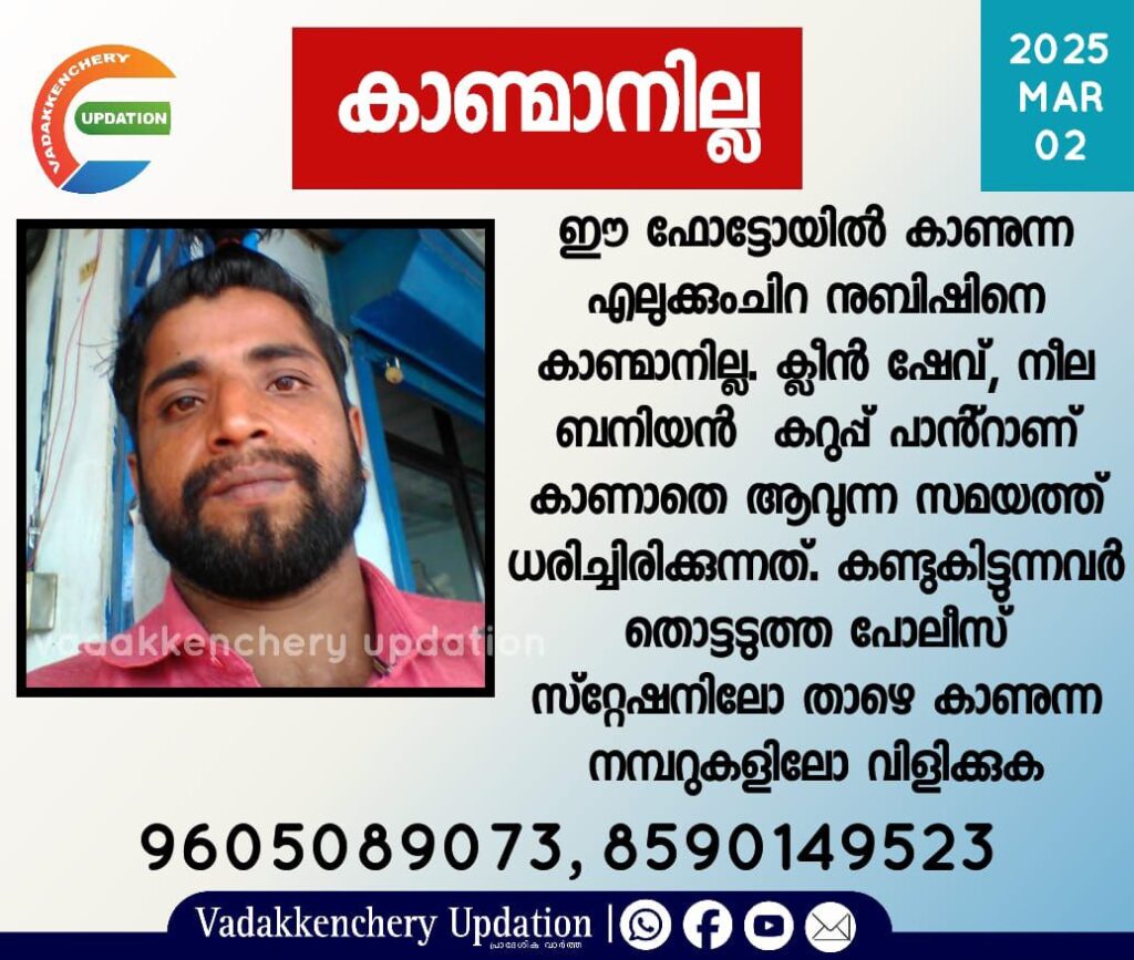 ഈ ഫോട്ടോയിൽ കാണുന്ന എലുക്കുംചിറ നുബിഷിനെ കാണ്മാനില്ല. ക്ലീൻ ഷേവ്, നീല ബനിയൻ കറുപ്പ് പാൻ്റാണ് കാണാതെ ആവുന്ന സമയത്ത് ധരിച്ചിരിക്കുന്നത്. കണ്ടുകിട്ടുന്നവർ തൊട്ടടുത്ത പോലീസ് സ്റ്റേഷനിലോ താഴെ കാണുന്ന നമ്പറുകളിലോ വിളിക്കുക