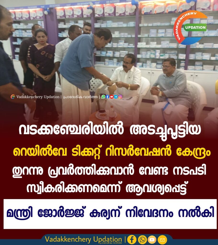 വടക്കഞ്ചേരി ഇന്ദിര പ്രിയദർശിനി ബസ്സ് സ്റ്റാൻറിൽ പ്രവർത്തിച്ചിരുന്ന റെയിൽവേ ടിക്കറ്റ് റിസർവേഷൻ കേന്ദ്രം 2025 ഫെബ്രുവരി മാസം മുതൽ പ്രവർത്തിക്കുന്നില്ല.
