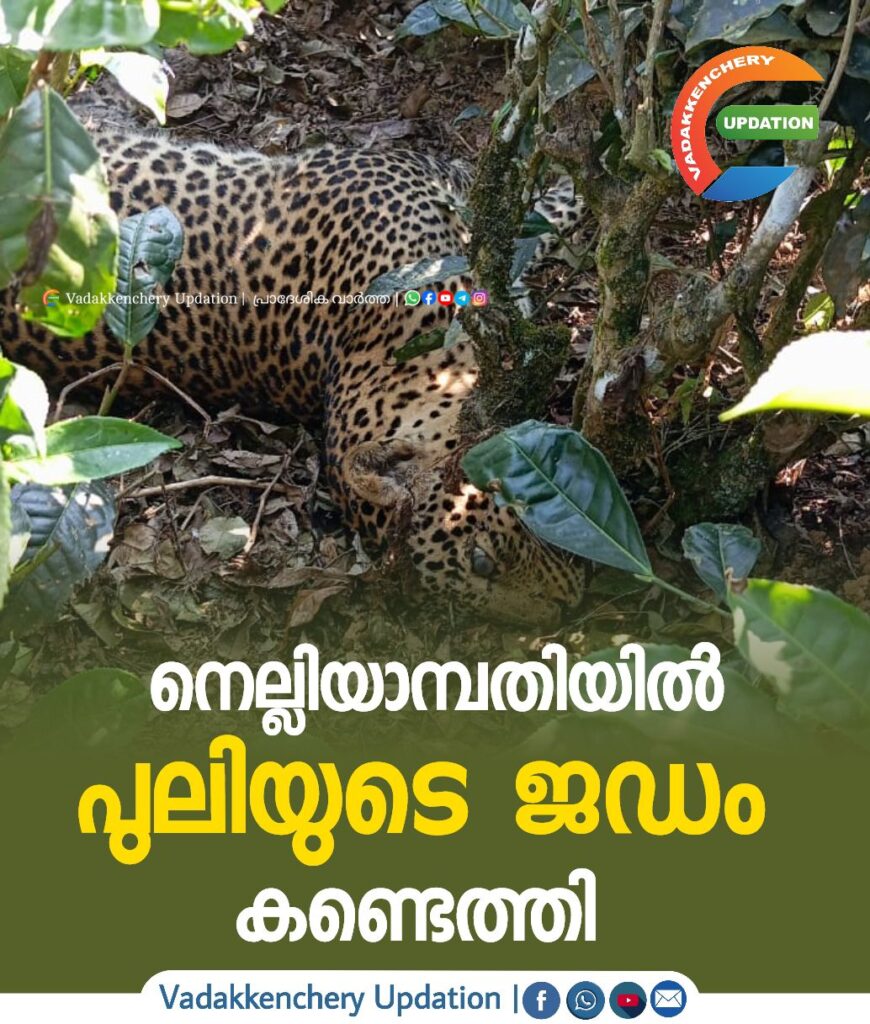 നെല്ലിയാമ്പതി എ. വി. ടി. ലില്ലി ഡിവിഷൻ ചായ തോട്ടത്തിൽ ചത്ത നിലയിൽ പുലിയെ കണ്ടെത്തി. ബുധനാഴ്ച രാവിലെ ചായ തോട്ടത്തിൽ മരുന്നു തളിക്കാൻ പോയ തൊഴിലാളികളാണ് ചായ ചെടികൾക്കിടയിൽ ചെറിയ രീതിയിൽ അഴുകിയ പുലിയുടെ ജഡം കണ്ടെത്തിയത്. ജഡം വീർത്ത് അഴുകിത്തുടങ്ങി ചെറിയ രീതിയിൽ ദുർഗന്ധവും ഈച്ചകളുടെ ആക്രമണവും ഉണ്ടായിട്ടുണ്ട്. വിവരമറിയിച്ചതിനെ തുടർന്ന് നെല്ലിയാമ്പതി ഡെപ്യൂട്ടി റേഞ്ച് ഫോറസ്റ്റ് ഓഫീസർ ജയേന്ദ്രനും സംഘവും സ്ഥലത്തെത്തി പുലിയുടെ ജഡം പരിശോധിച്ചു. രണ്ടുദിവസത്തെ പഴക്കമുണ്ടെന്ന് വനം അധികൃതർ പറഞ്ഞു. പോസ്റ്റ് മാറ്റം നടപടികൾക്ക് ശേഷമേ മരണകാരണവും മറ്റും അറിവാകുകയുള്ളൂ. വ്യാഴാഴ്ച വനം വകുപ്പ് വെറ്റിനറി സർജനും മറ്റ് ഉയർന്ന ഉദ്യോഗസ്ഥരും സ്ഥലത്തെത്തി പോസ്റ്റുമാറ്റം നടത്തിയതിനുശേഷമെ ജഡം സംസ്കരിക്കുകയുള്ളൂ. ചാലക്കുടിയിൽ ഏഴാറ്റുമുഖം ഗണപതി എന്ന ആനയ്ക്ക് ചികിത്സാർത്ഥം വനം വകുപ്പ് മൃഗഡോ ഡോക്ടർമാർ അവിടേക്ക് പോയതിനാലാണ് പോസ്റ്റുമോർട്ടം വ്യാഴാഴ്ചയിലേക്ക് മാറ്റിയതെന്ന് വനം വകുപ്പ് അധികൃതർ പറഞ്ഞു. പുലിയുടെ ജഡം പോസ്റ്റ് മോർട്ടം കഴിയുന്നതുവരെ സ്ഥലത്തുനിന്ന് നീക്കാതെ കാവൽ ഏർപ്പെടുത്തിയിരിക്കുകയാണ്.