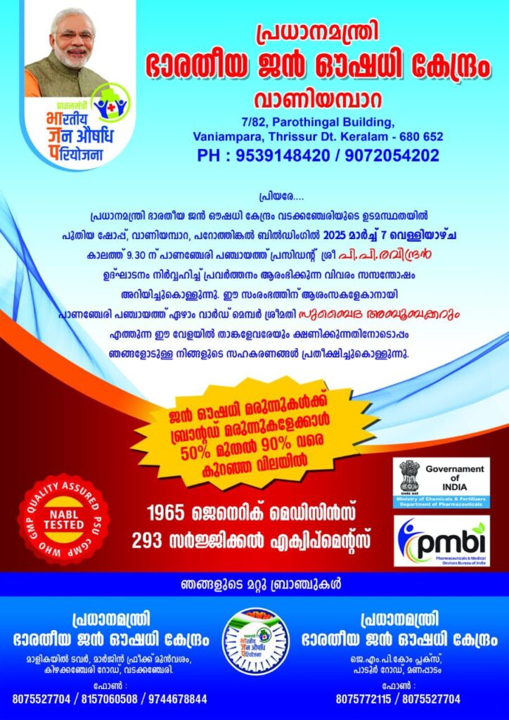 പ്രധാനമന്ത്രി ഭാരതീയ ജൻ ഔഷധി കേന്ദ്രം വടക്കഞ്ചേരിയുടെ ഉടമസ്ഥതയിൽ പുതിയ ഷോപ്പ്, വാണിയമ്പാറ, പറോത്തിങ്കൽ ബിൽഡിംഗിൽ നാളെ 2025 മാർച്ച് 7 വെള്ളിയാഴ്ച കാലത്ത് 9.30 ന് പാണഞ്ചേരി പഞ്ചായത്ത് പ്രസിഡൻ്റ് പി.പി.രവീന്ദ്രൻ ഉദ്ഘാടനം നിർവ്വഹിക്കുന്നു. പാണഞ്ചേരി പഞ്ചായത്ത് ഏഴാം വാർഡ് മെമ്പർ സുബൈദ അബൂബക്കറും ഈ സംരംഭത്തിന് ആശംസകൾ നേരുന്നു.