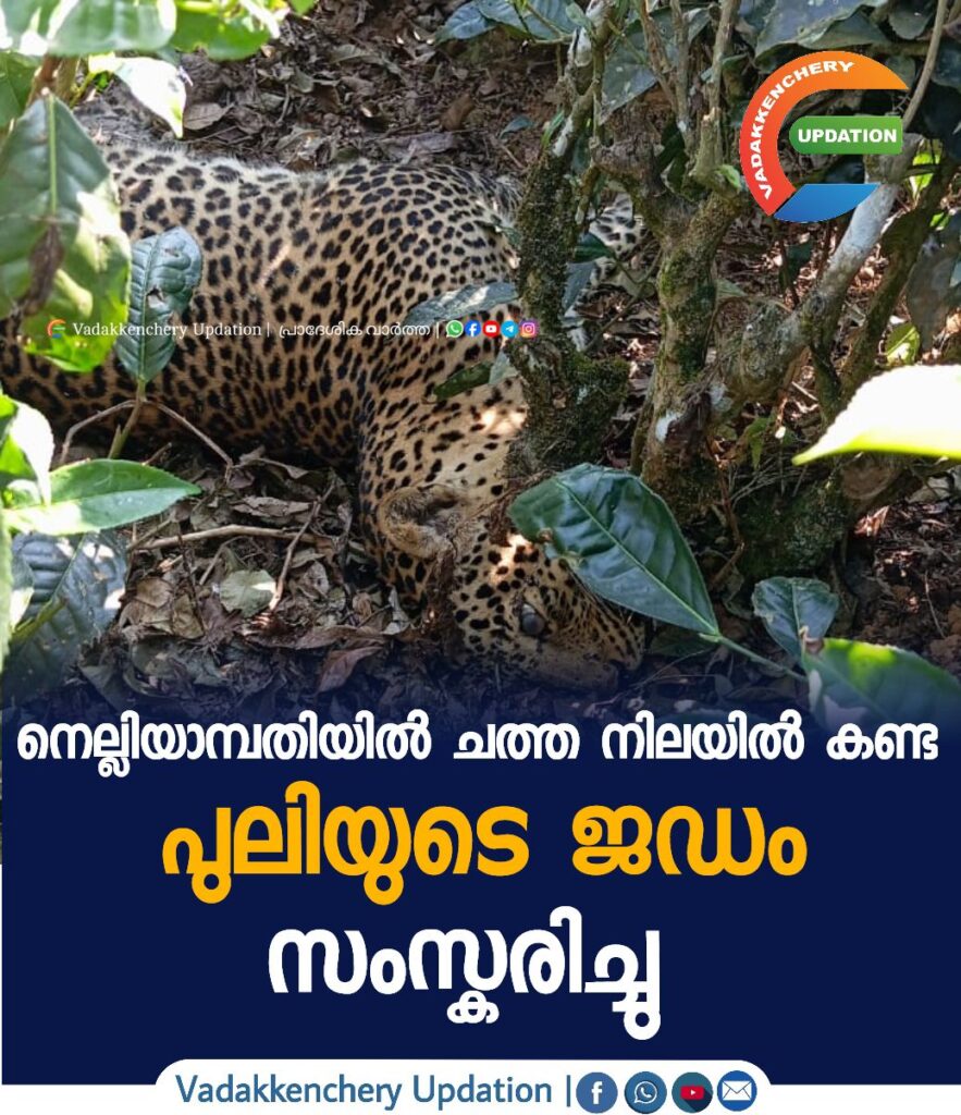 നെല്ലിയാമ്പതി ചായ തോട്ടത്തിൽ കഴിഞ്ഞദിവസം ചത്തനിലയിൽ കണ്ട പുലിയുടെ ജഡം സംസ്കരിച്ചു. കുരുക്കിൽ പെട്ട് മുറിവുപറ്റിയതിനെ തുടർന്നാണ് പുലി ചത്തതെന്ന് പോസ്റ്റ് മോർട്ടത്തിൽ കണ്ടെത്തി. വനം ഉദ്യോഗസ്ഥരുടെയും മൃഗ ഡോക്ടർമാരുടെയും നാഷണൽ ടൈഗർ കൺസർവേഷൻ അതോറിറ്റി, എൻ.ജി.ഒ പ്രതിനിധി എന്നിവരുടെ സാന്നിധ്യത്തിൽ പോസ്റ്റുമോർട്ടം നടത്തി ജഡം സമീപത്തു തന്നെ സംസ്കരിച്ചു.