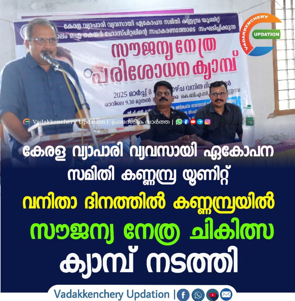 കണ്ണമ്പ്ര; വ്യാപാരി വ്യവസായി ഏകോപന സമിതി കണ്ണമ്പ്ര യൂണിറ്റ് ,ഒറ്റപ്പാലം വെൽഫയർ ട്രസ്റ്റ്,ഐ കെയർ ഹോസ്പിറ്റൽ എന്നിവരുടെ സംയുക്താഭിമുഘ്യത്തിൽ സൗജന്യ നേത്ര ചികിൽസാ ക്യാമ്പ് സംഘടിപ്പിച്ചു.