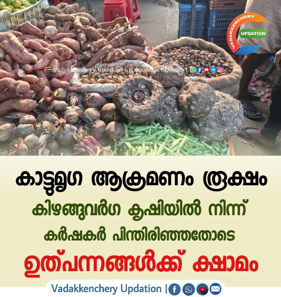 വടക്കഞ്ചേരി ; കാട്ടുമൃഗ ആക്രമണം വർധിച്ചതോടെ കിഴങ്ങുവര്ഗ കൃഷിയോടു താത്പര്യം കുറഞ്ഞു. ഇതോടെ ഉത്പന്നങ്ങള്കടുത്ത ക്ഷാമമാണ്. ഒപ്പം വിലയേറുകയും ചെയ്തു.