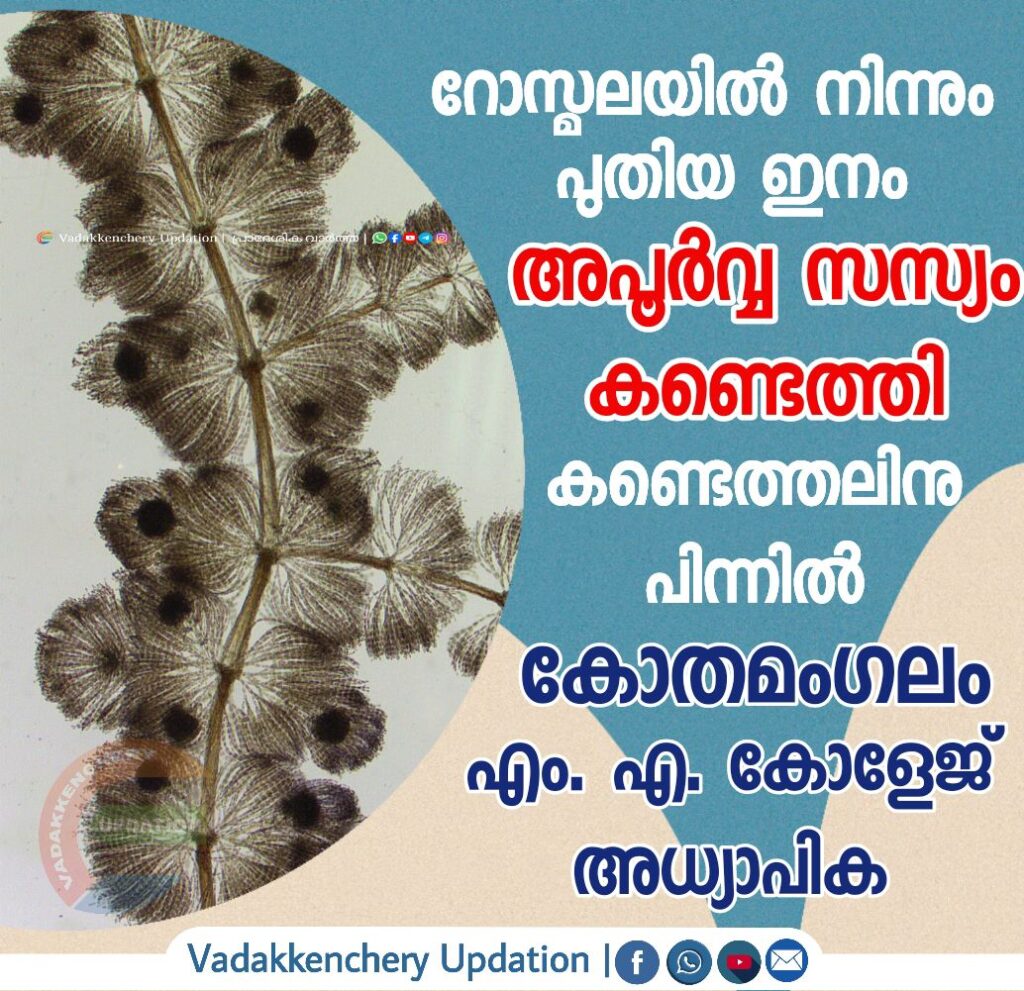 കോതമംഗലം ;കേരളത്തിന്റെ സസ്യ വൈവിധ്യത്തിലേക്ക് ഒരു പുതിയ പേര് കൂടി. കൊല്ലം ജില്ലയിലെ റോസ് മലയിൽ നിന്ന് ഒരു പുതിയ ഇനം പായൽ കണ്ടെത്തി. ശുദ്ധജല ആവാസ വ്യവസ്ഥകളിൽ മാത്രം കാണുന്ന ഫ്രഷ് വാട്ടർ റെഡ് ആൽഗെ വിഭാഗത്തിലെ ഷിത്തിയ ജീനസിൽ ഉൾപ്പെടുന്ന സസ്യമാണ് കണ്ടെത്തിയത്. “ഷിത്തിയ റോസ്മലയൻസിസ്” എന്നാണ് ഈ പായലിന് ഗവേഷകർ ശാസ്ത്രീയ നാമം നൽകിയിരിക്കുന്നത്.