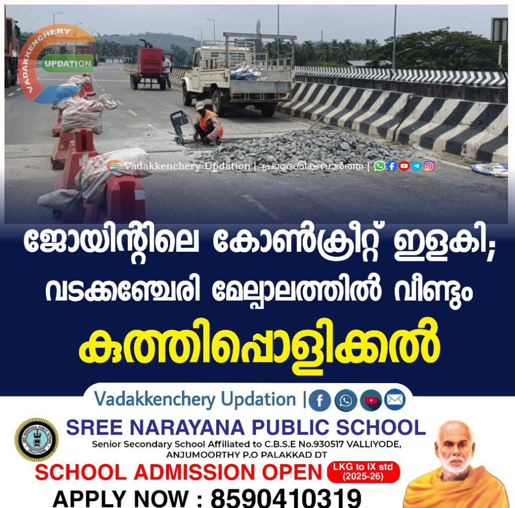 വടക്കഞ്ചേരി ;വടക്കഞ്ചേരി-മണ്ണുത്തി ആറുവരിപ്പാതയിലെ വടക്കഞ്ചേരി മേൽപ്പാലത്തിൽ ജോയിന്റിൽ വീണ്ടും തകർച്ച. ഇതോടെ കുത്തിപ്പൊളിച്ച് നന്നാക്കൽ തുടങ്ങി. തൃശ്ശൂർദിശയിലേക്കുള്ള പാലത്തിലാണ് കുത്തിപ്പൊളിക്കൽ. ഈ ഭാഗത്ത് ഒരു വരിയായാണിപ്പോൾ ഗതാഗതം.