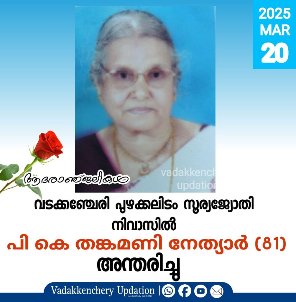 വടക്കഞ്ചേരി പുഴക്കലിടം സൂര്യജ്യോതി നിവാസിൽ പി. കെ. തങ്കമണി നേത്യാർ (81) അന്തരിച്ചു.