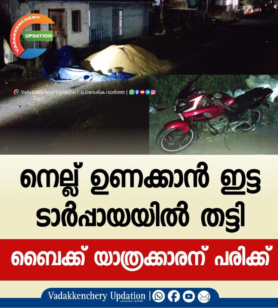 ആലത്തൂരിൽ നിന്നും വടക്കഞ്ചേരി ദിശയിലേക്ക് പോകുമ്പോൾ ഇരട്ടകുളം സർവീസ് റോഡിൽ നെല്ല് ഉണക്കാൻ ഇട്ടതിൻ്റെ മുകളിൽ ടാർപ്പായ ഇട്ട് വെച്ചതിൽ തട്ടി ബൈക്ക് മറിയുകയായിരുന്നു . ബൈക്ക് യാത്രക്കാരന് പരിക്കുണ്ട് . ഇവിടെ നെല്ല് ഉണക്കുന്നത് കാരണം രാത്രി ആ വഴി വരുന്ന വാഹനങ്ങൾ അപകടത്തിൽ പെടുന്നത് പതിവാണെന്ന് ബൈക്ക് യാത്രക്കാർ പറഞ്ഞു. ഉടൻ തന്നെ ബൈക്ക് യാത്രക്കാരനെ ആശുപത്രിയിലേക്ക് കൊണ്ടുപോയി .