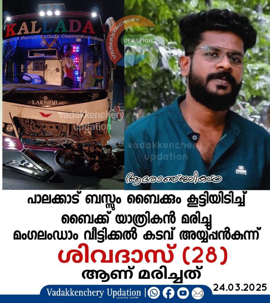 പാലക്കാട് ബസ്സും ബൈക്കും കൂട്ടിയിടിച്ച് ബൈക്ക് യാത്രികന് ദാരുണാന്ത്യം. ഇന്നലെ രാത്രി 9 മണിയോട് കൂടി കണ്ണനൂരിലാണ് അപകടമുണ്ടായത്. ബാംഗ്ലൂരിലേക്ക് പോവുകയായിരുന്ന സ്വകാര്യ ബസ് ബൈക്കിൽ ഇടിക്കുകയായിരുന്നു. അപകടത്തിൽ മരിച്ച യുവാവിന്റെ മൃതദേഹം പാലക്കാട് ജില്ലാ ആശുപത്രി മോർച്ചറിയിലേക്ക് മാറ്റി.അച്ഛൻ: നമശിവായ. അമ്മ: പാർവതി. സഹോദരിമാർ: പ്രിയ,ശിവ രഞ്ജിനി. സഹിതരൻ: ശിവ പ്രസാദ്.