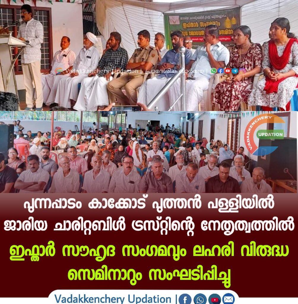 പുന്നപ്പാടം കാക്കോട് പുത്തൻ പള്ളിയിൽ ജാരിയ ചാരിറ്റബിൾ ട്രസ്റ്റിന്റെ നേതൃത്വത്തിൽ ഇഫ്താർ സൗഹൃദ സംഗമവും ലഹരി വിരുദ്ധ സെമിനാറും സംഘടിപ്പിച്ചു. റിട്ട.DySP VS.മുഹമ്മദ് കാസിം ഉദ്ഘാടനം നിർവഹിച്ചു. ട്രസ്റ്റ് ചെയർമാൻ PK .ഉമർ ഫാറൂഖ് അധ്യക്ഷത വഹിച്ചു.