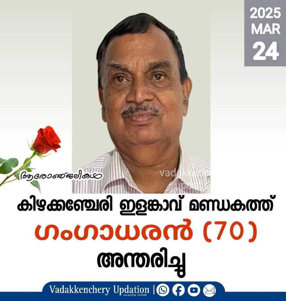 കിഴക്കഞ്ചേരി ഇളങ്കാവ് മണ്ഡകത്ത് ഗംഗാധരൻ (70) അന്തരിച്ചു. സംസ്കാരം നാളെ (25-3-25 ചൊവ്വാഴ്ച്ച) രാവിലെ 9 മണിക്ക് തിരുവില്ലാമല ഐവർമഠത്തിൽ.